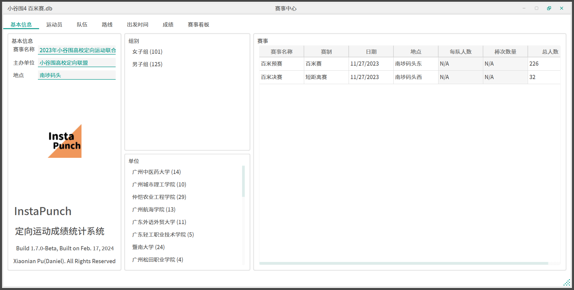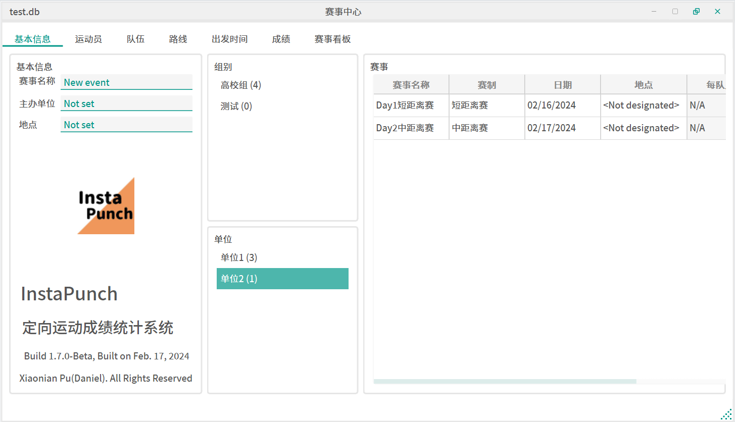 右键空白处可以新建竞赛日,新的竞赛日默认为短距离赛,双击赛事各单元可以进行修改名称、赛制、每队人数、棒次数量、地点、日期等。总人数则会根据运动员在各个竞赛日的参赛情况自动计算。