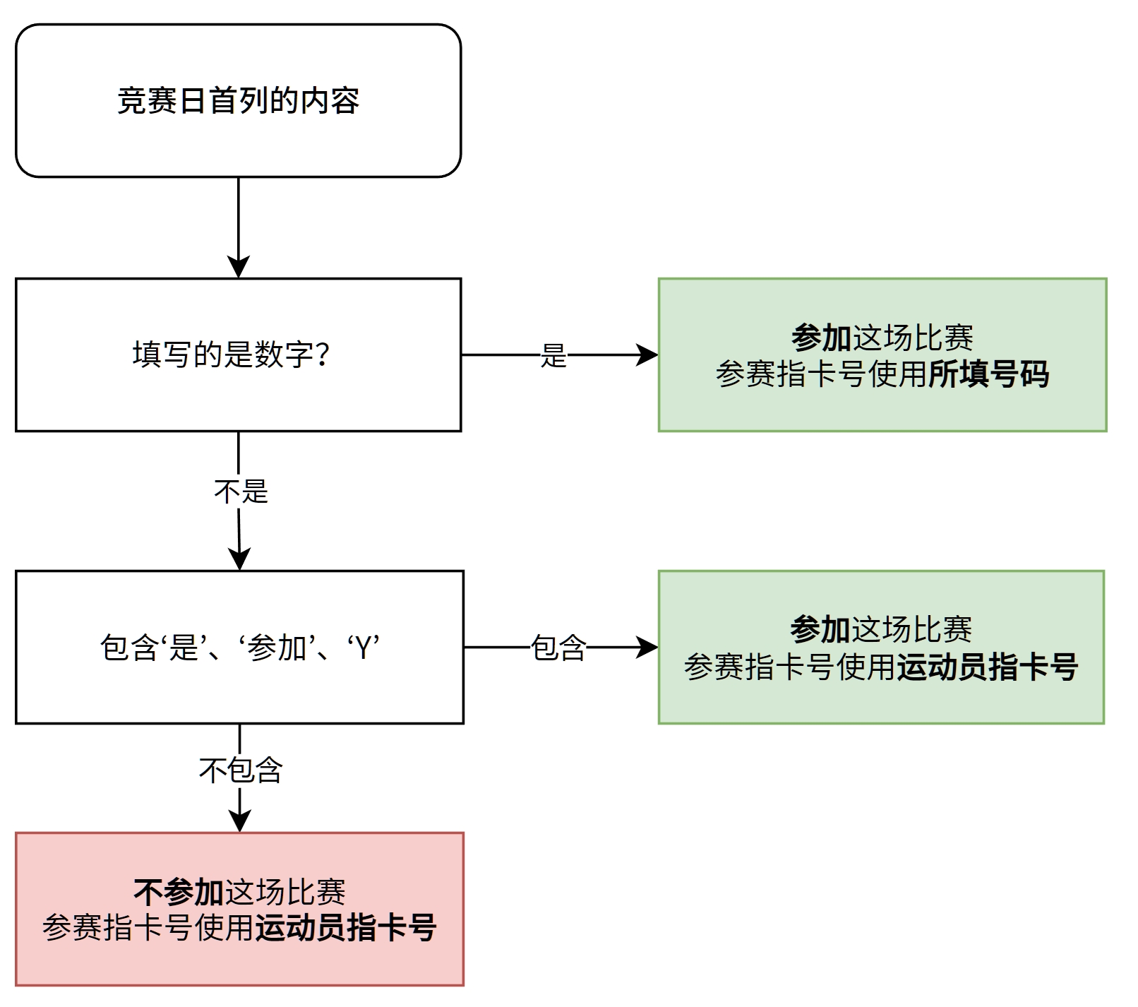 这一列将同时决定该运动员是否参加本场比赛以及本场比赛使用的指卡号,具体而言按照如下规则处理