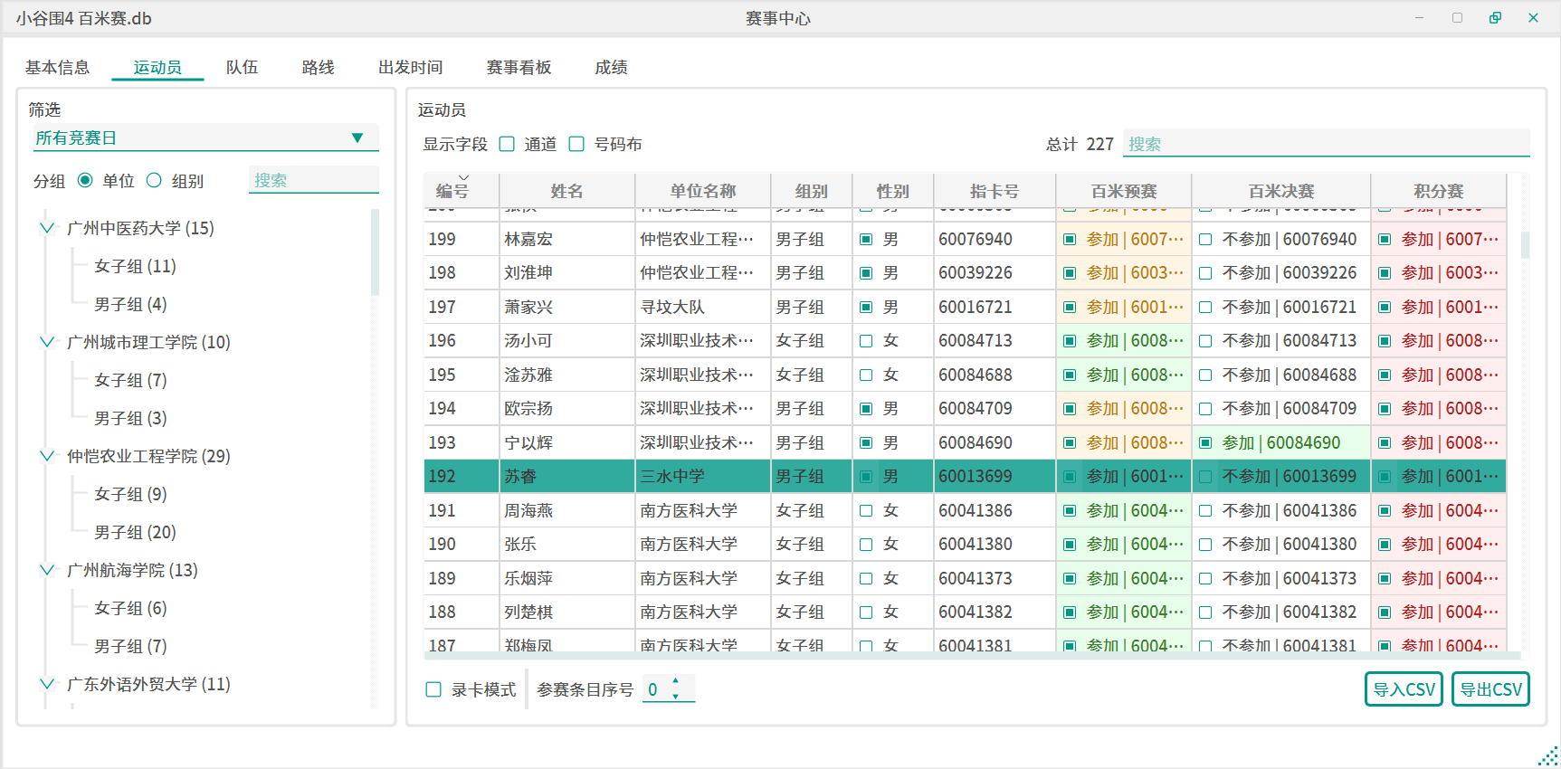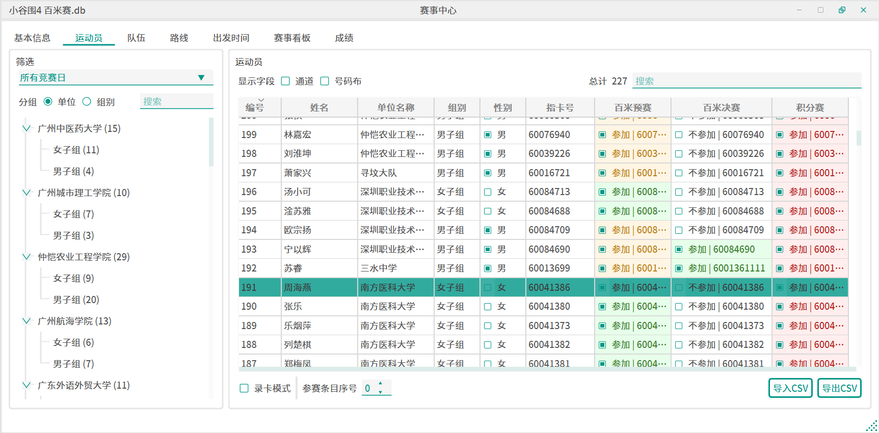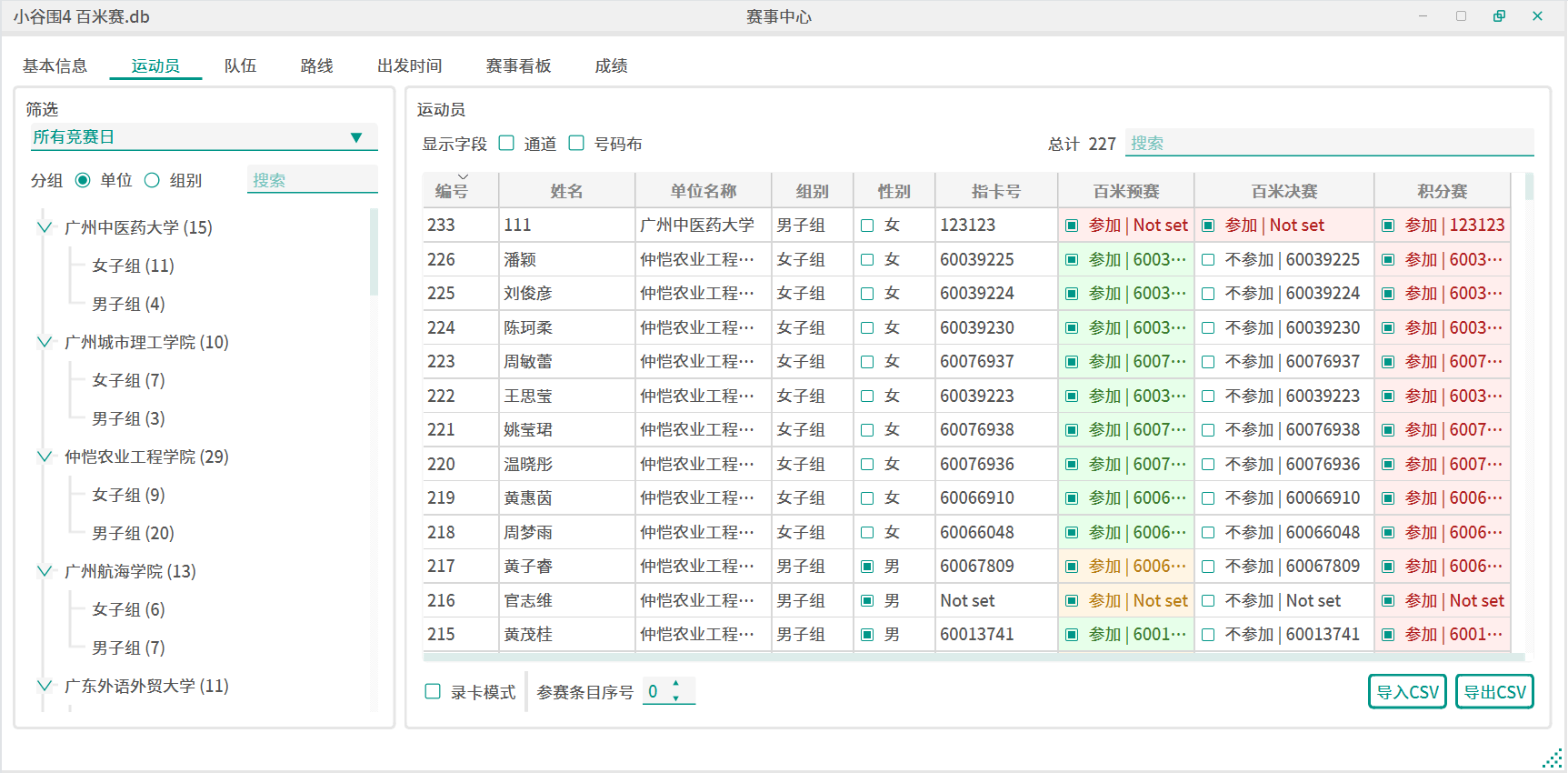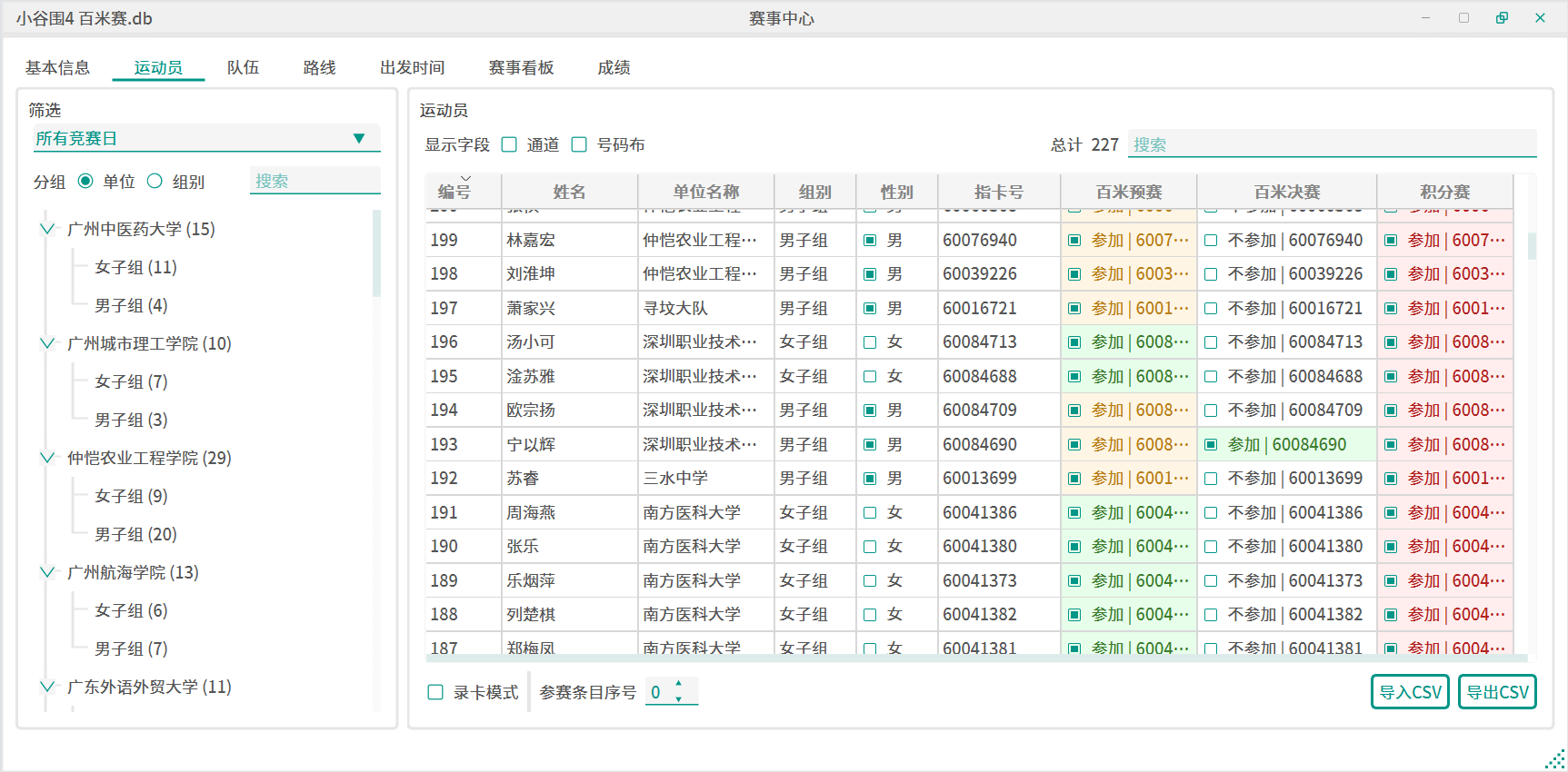 下图便是软件中的运动员管理页面。界面的右侧是运动员表格,右侧的参赛信息列数与建立的竞赛日有关,