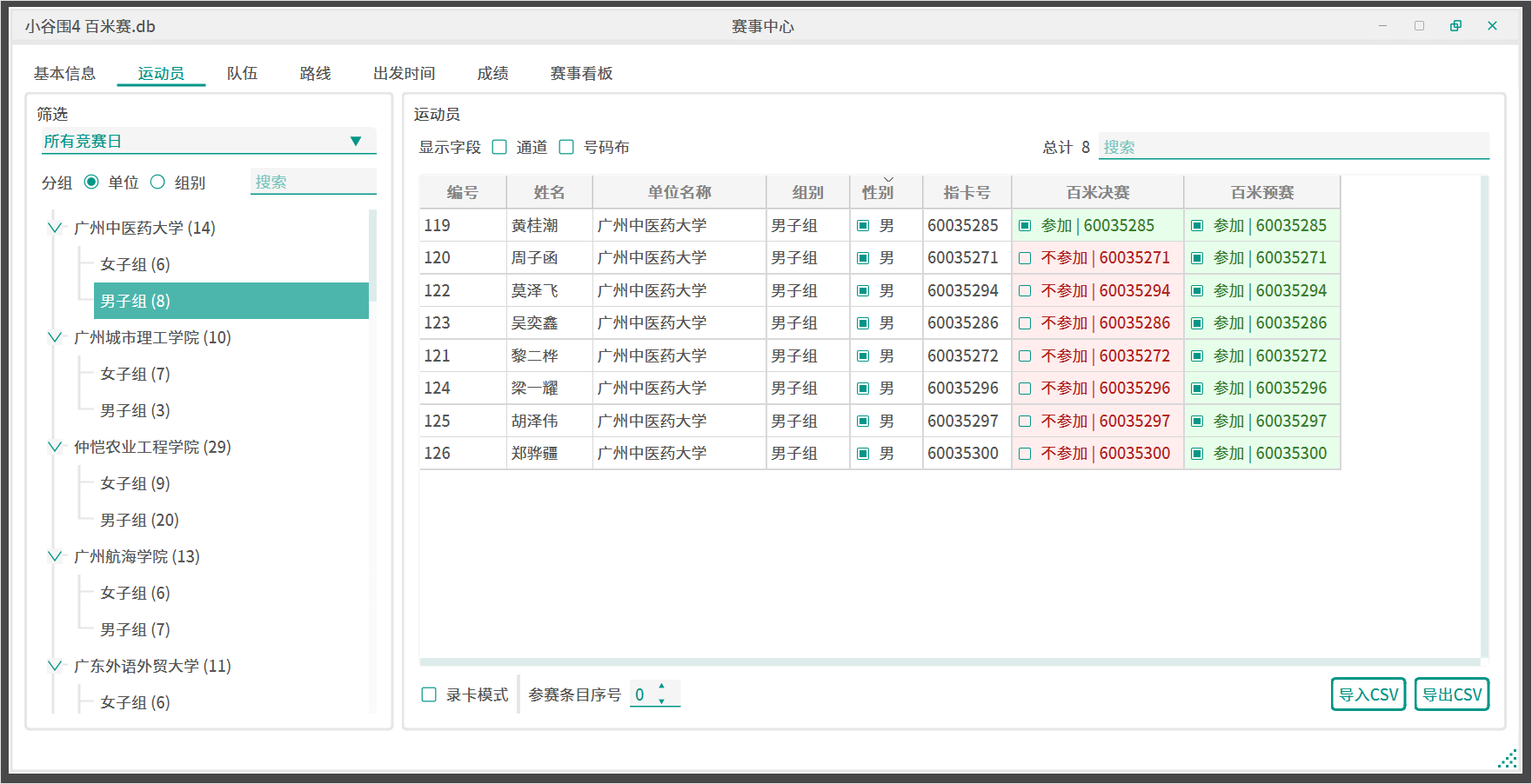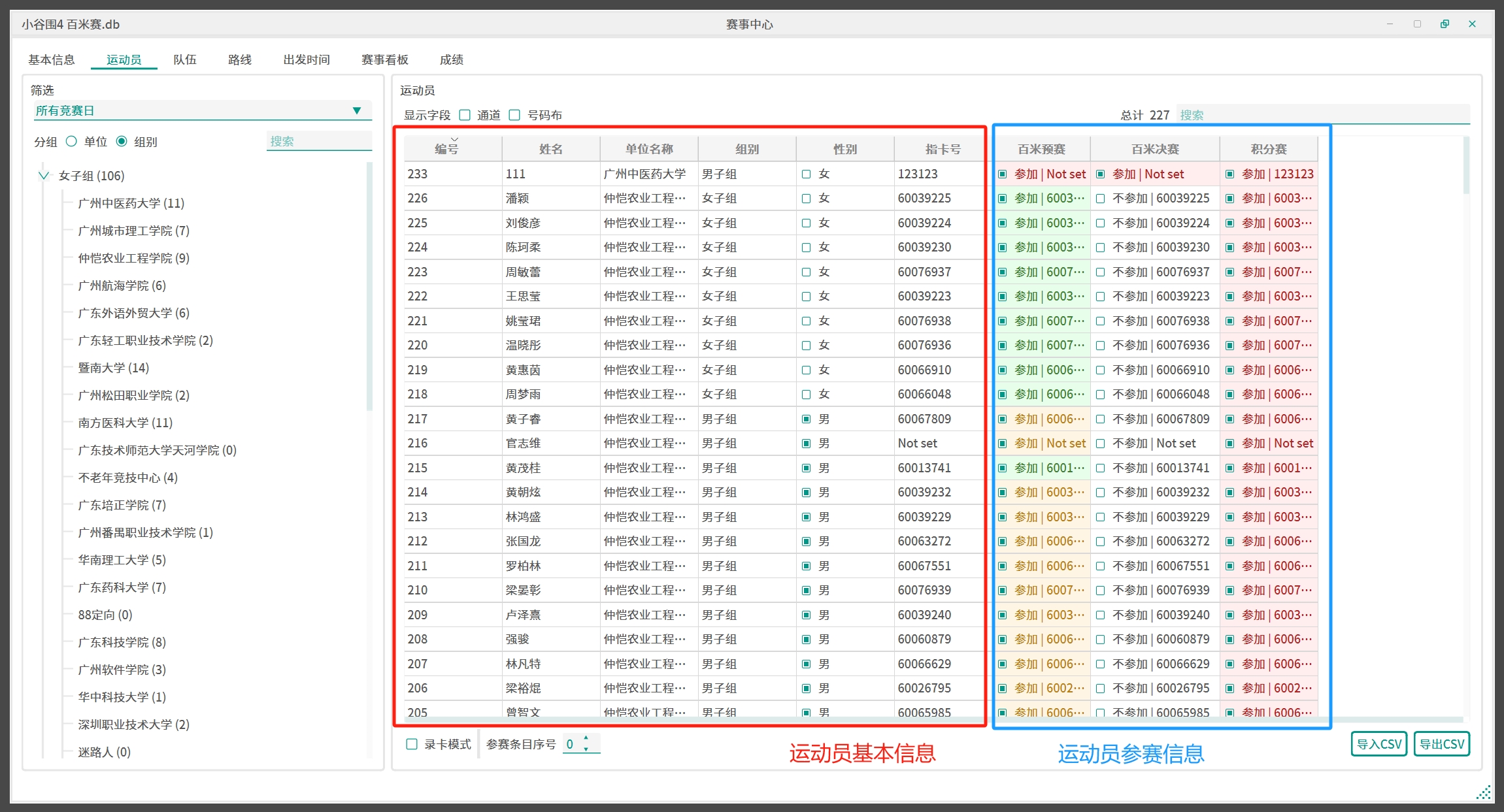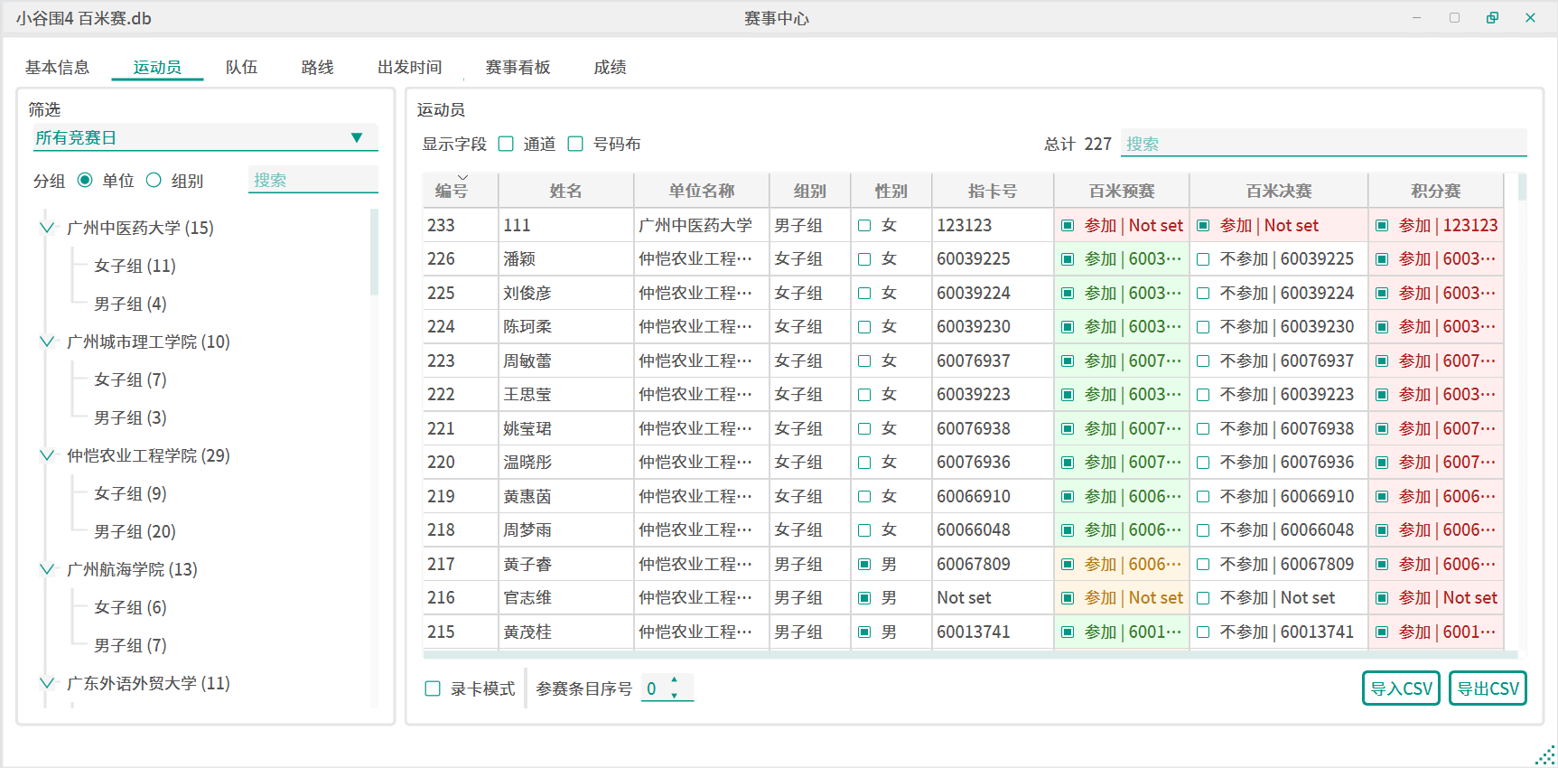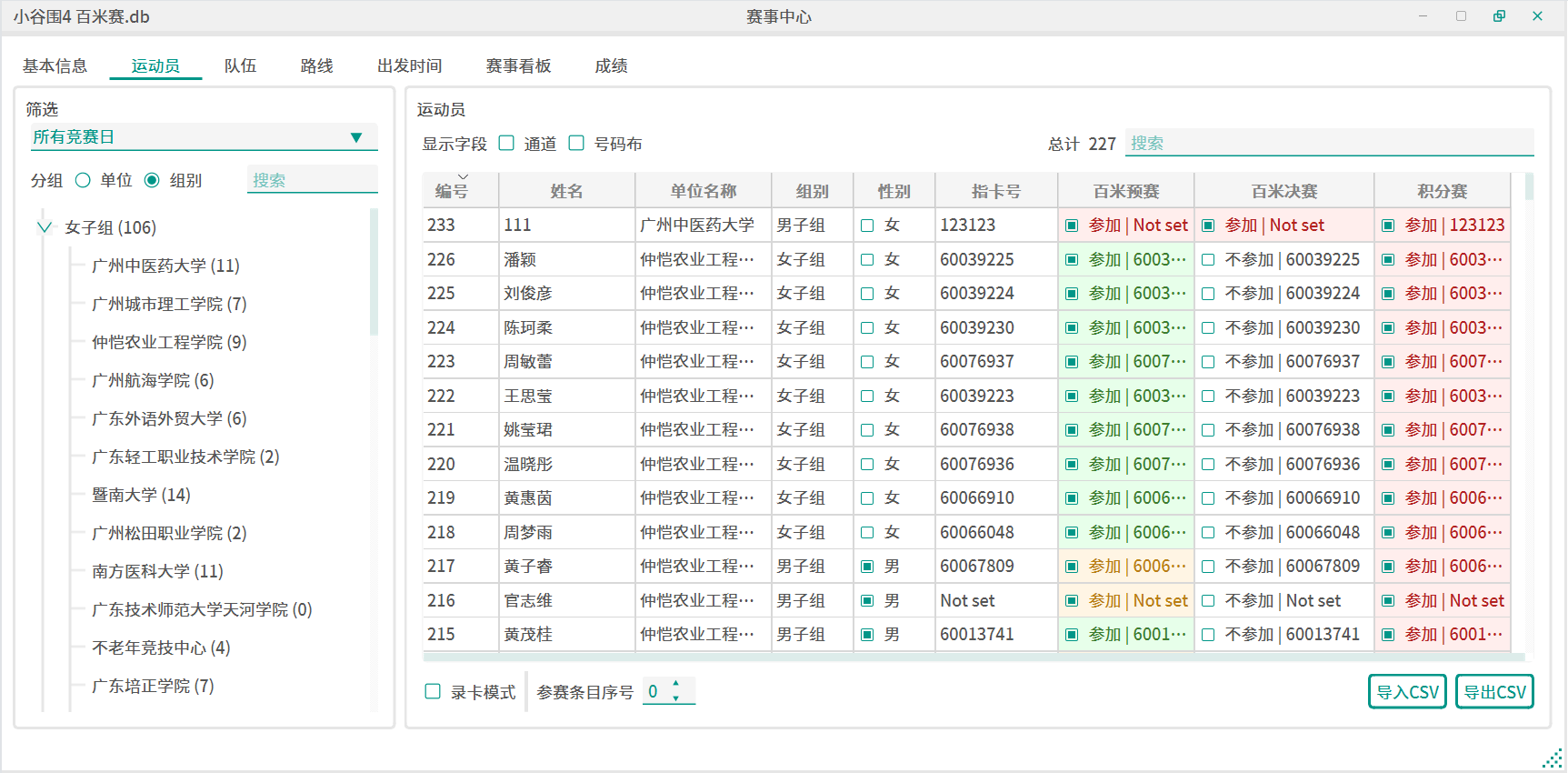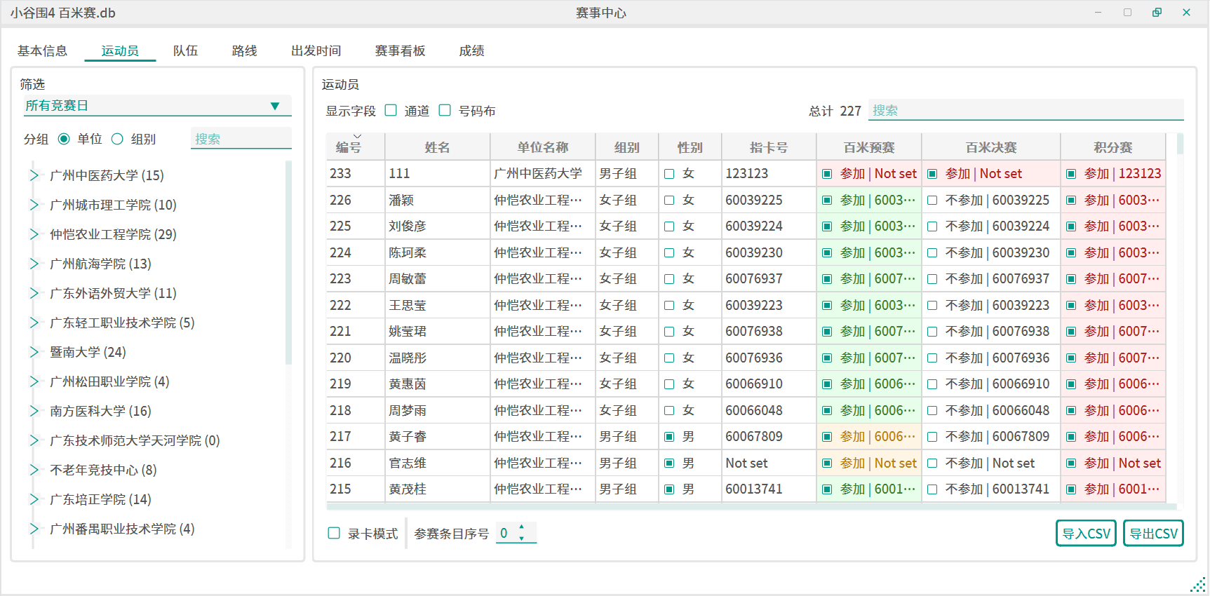 下图便是软件中的运动员管理页面。界面的右侧是运动员表格,右侧的参赛信息列数与建立的竞赛日有关,