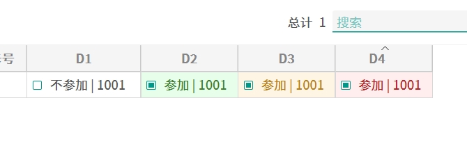 竞赛日每个单元格会使用不同的颜色标明各个运动员在对应竞赛日的情况。其中,白色代表不参加该竞赛日(下图D1),如果参加则有三种颜色状态:红色代表没有分配通道(下图D4),黄色代表分配了通道但是对应没有路线(下图D3),绿色表示通道和路线都已配置(下图D2)。通道是运动员每场赛事成绩统计的关键部分,你可以在后面的章节详细了解通道和路线的概念。