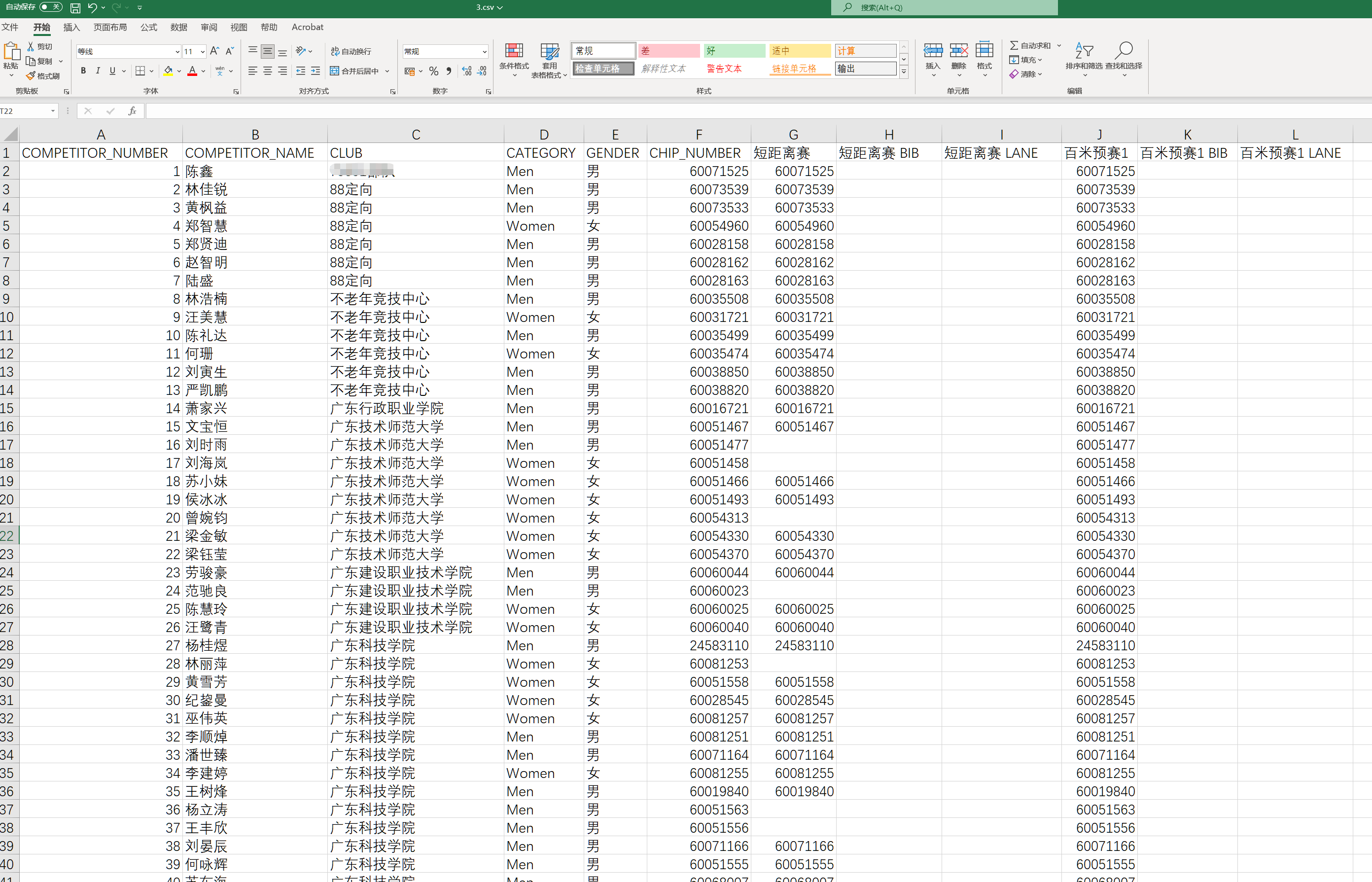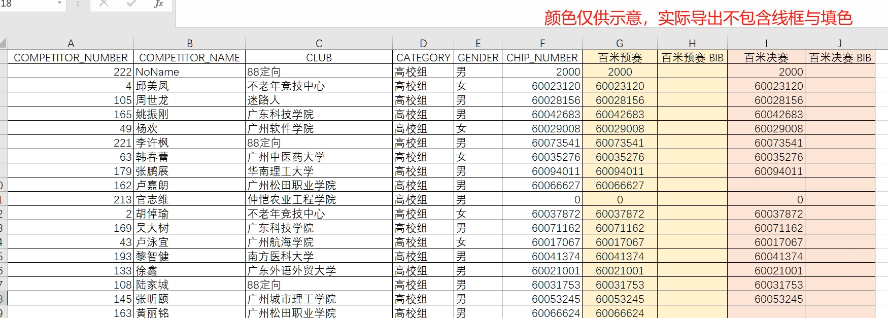 性别(GENDER)列不是必须的,如果未提供性别列且组别(CATEGORY)一栏使用了M**/W**/**男子组/**女子组等包含提示性别的字眼,会自动判断运动员性别。