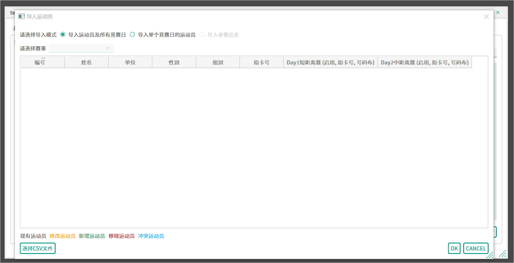 只需要点击运动员页面右下角的导出CSV即可获得所需的导入模板。模板的内容取决于竞赛日的配置。如果没有建立竞赛日,导出的CSV模板将只包含运动员基本信息的六个字段