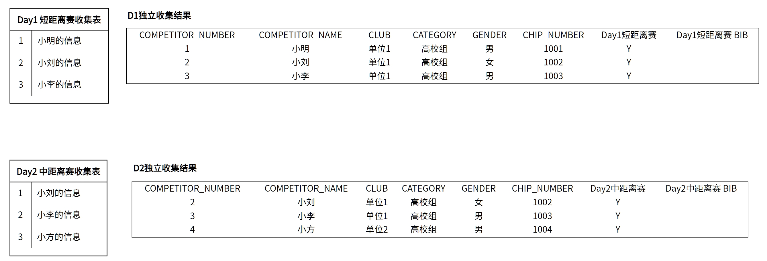 如果你的多日赛是每一个竞赛日单独收集,下图就是一个例子,有的运动员两场都会参加,有的则只会报名其中某一场,这导致两个竞赛日的收集表并不完全相交: