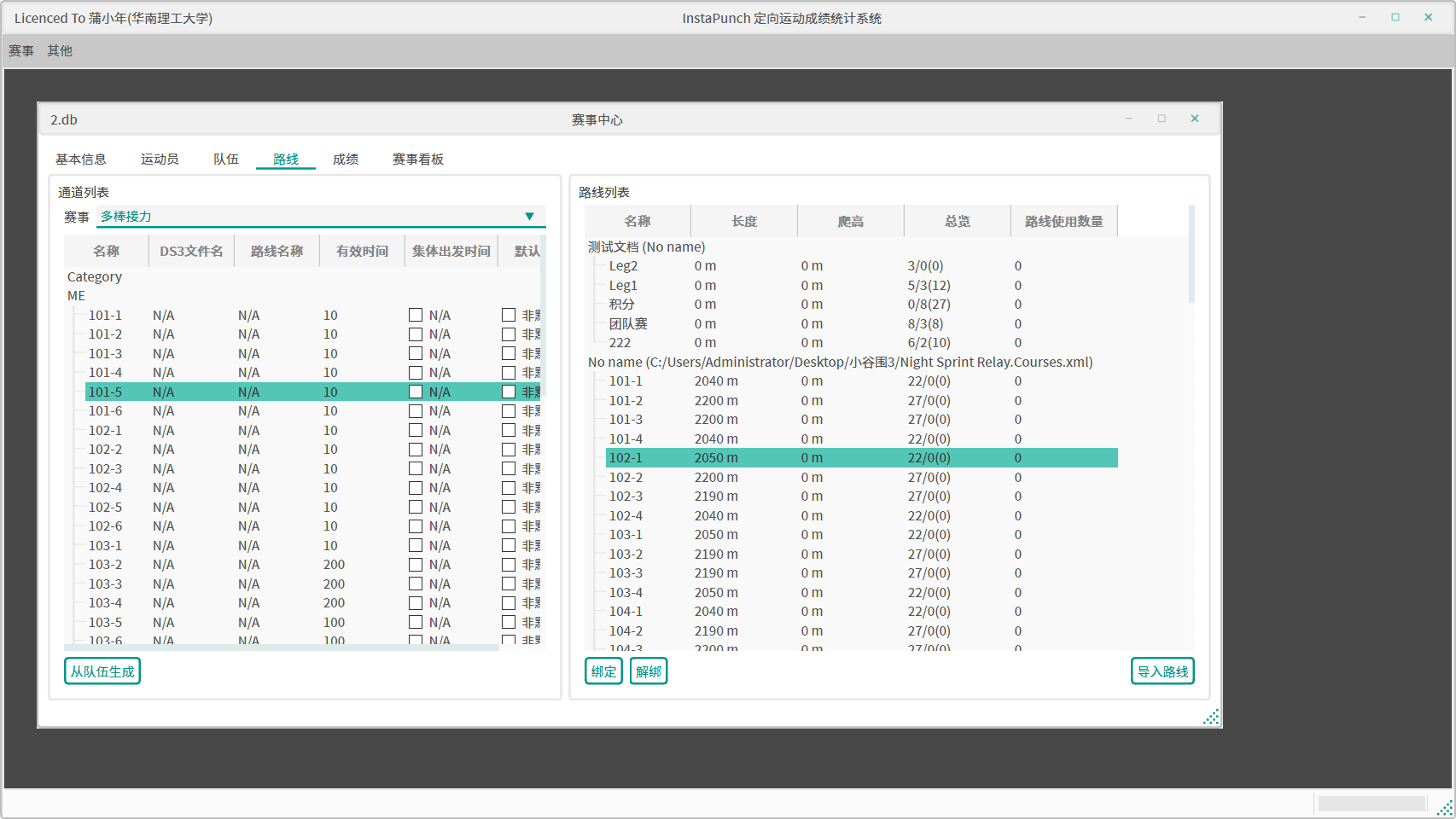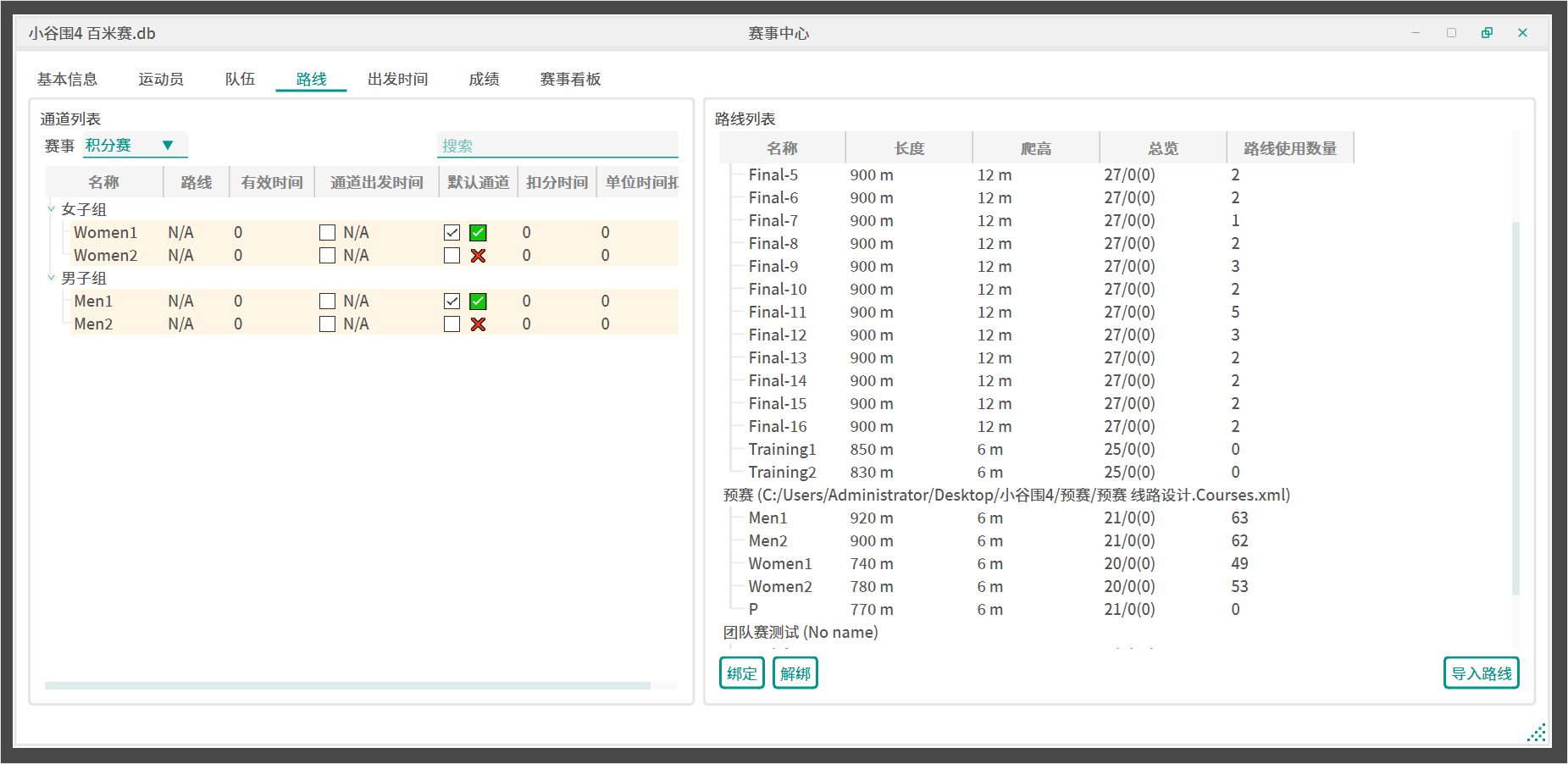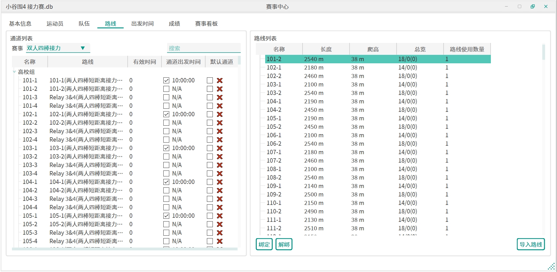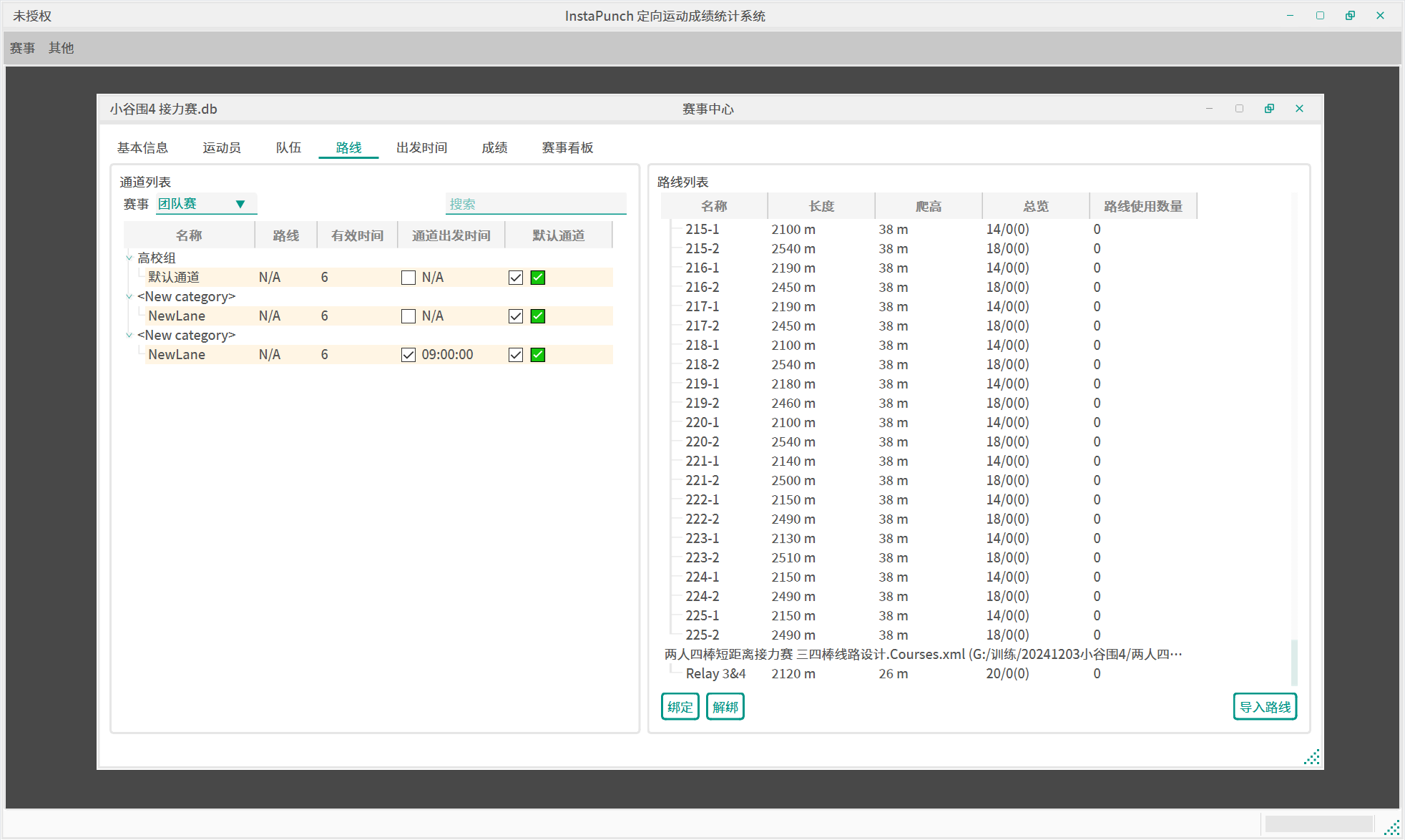 队伍名-棒次格式生成路线。 - 全选接力赛通道,右键使用导入的接力赛路线进行自动绑定。
