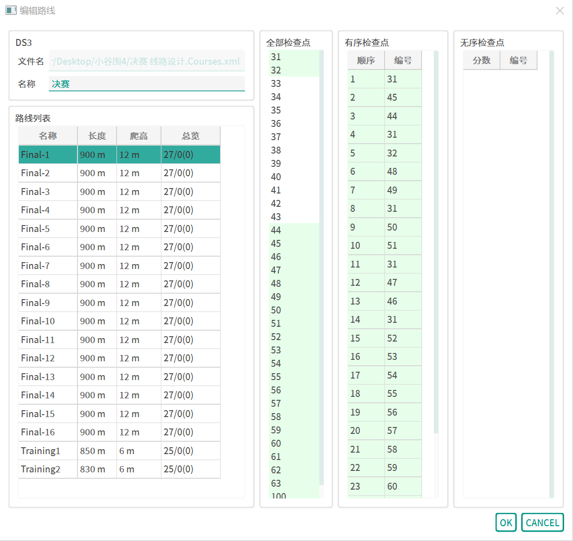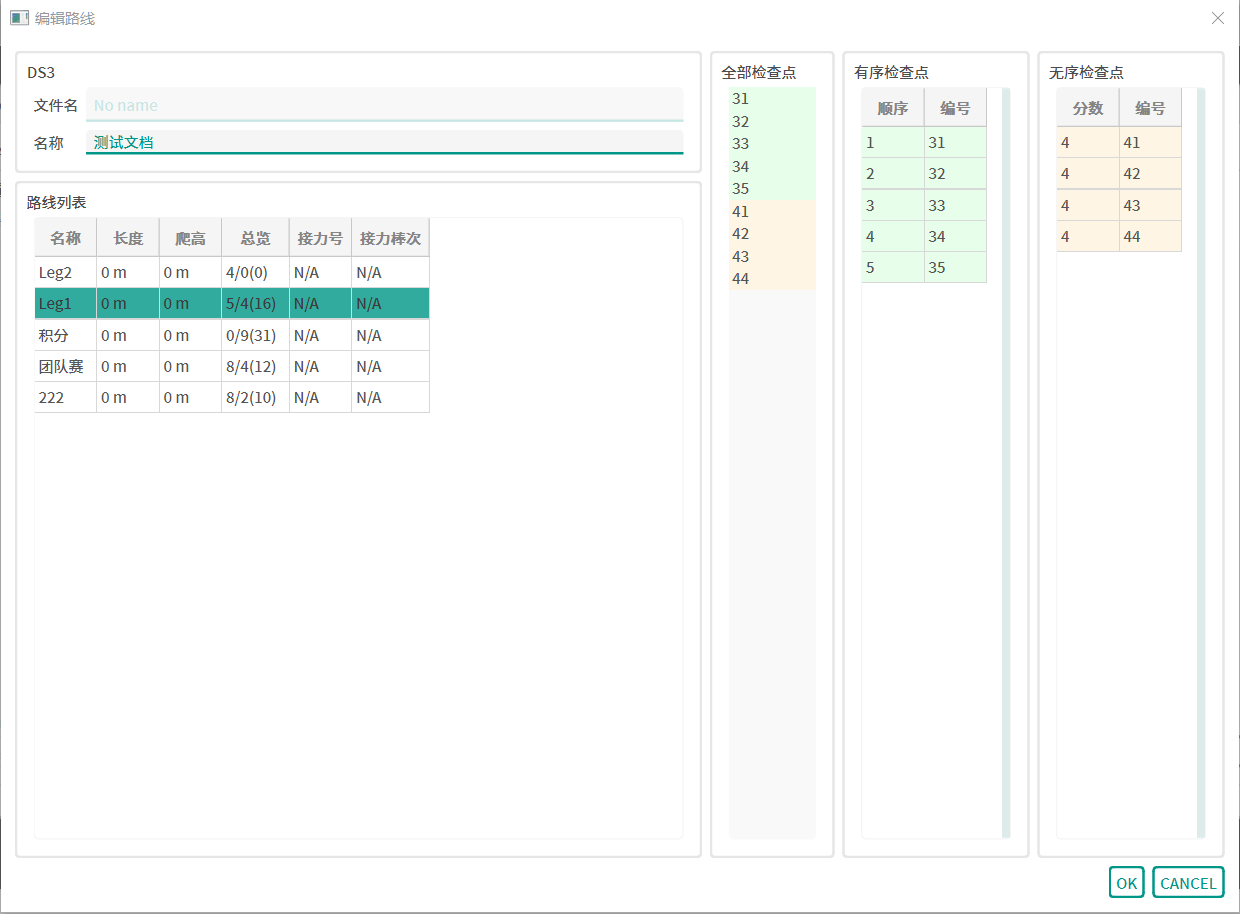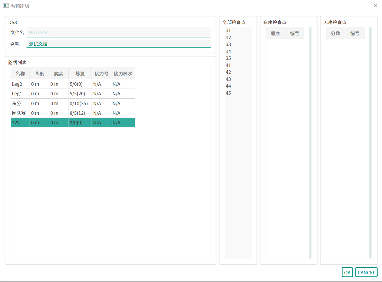 线路编辑窗口分为左中右三栏,左侧展示该线路设计文档中所有的线路,中间是所有使用到的检查点,右侧展示选定线路中使用的检查点。选中某一线路时,会显示当前线路的线路检查点情况,其中绿色标记的为有序检查点,橙色标记的为无序检查点。