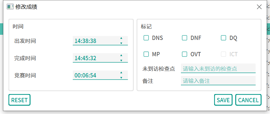右键任意成绩可以进行修改,支持添加和去除有效性标记、修改出发时间、终点时间、竞赛时间、备注和未到访的检查点。RESET按钮可以还原到本次修改前的状态。