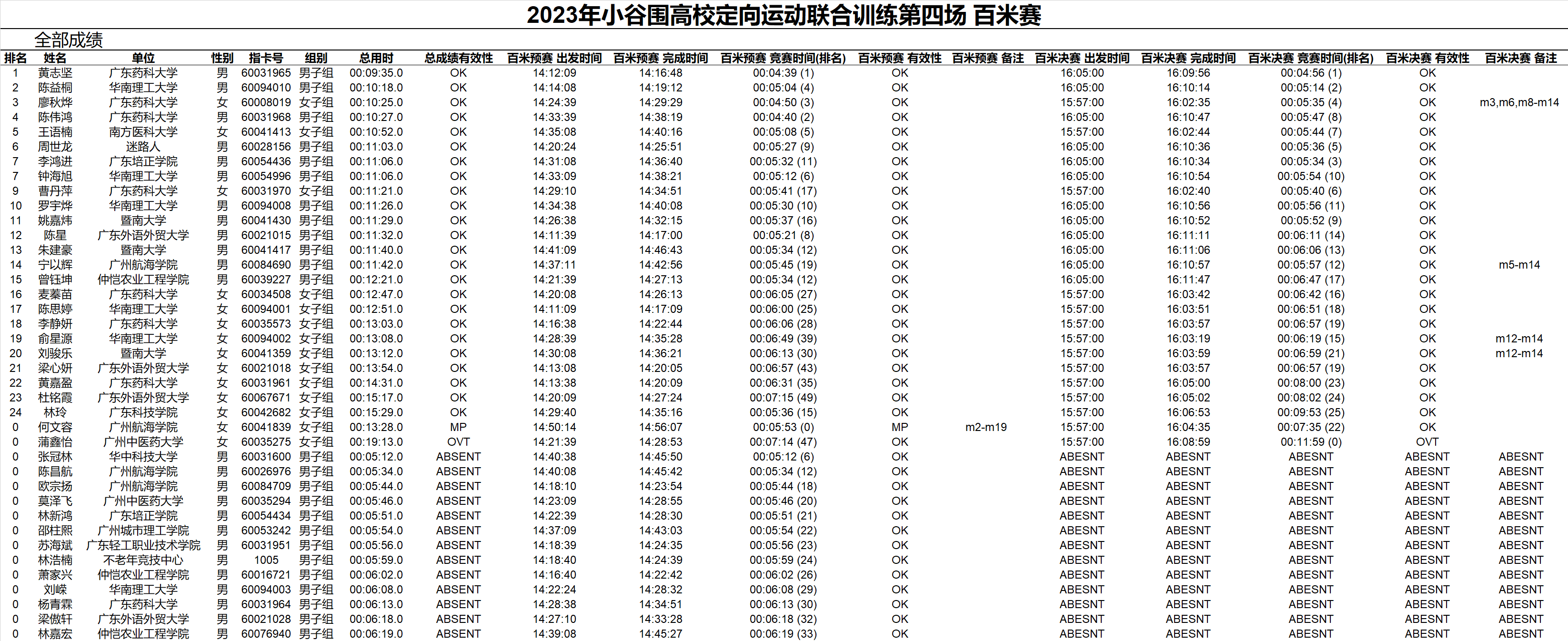 对于多场成绩,表格右侧会按照所选竞赛日生成对应的成绩列,这些列会显示该场的竞赛时间以及单场排名。