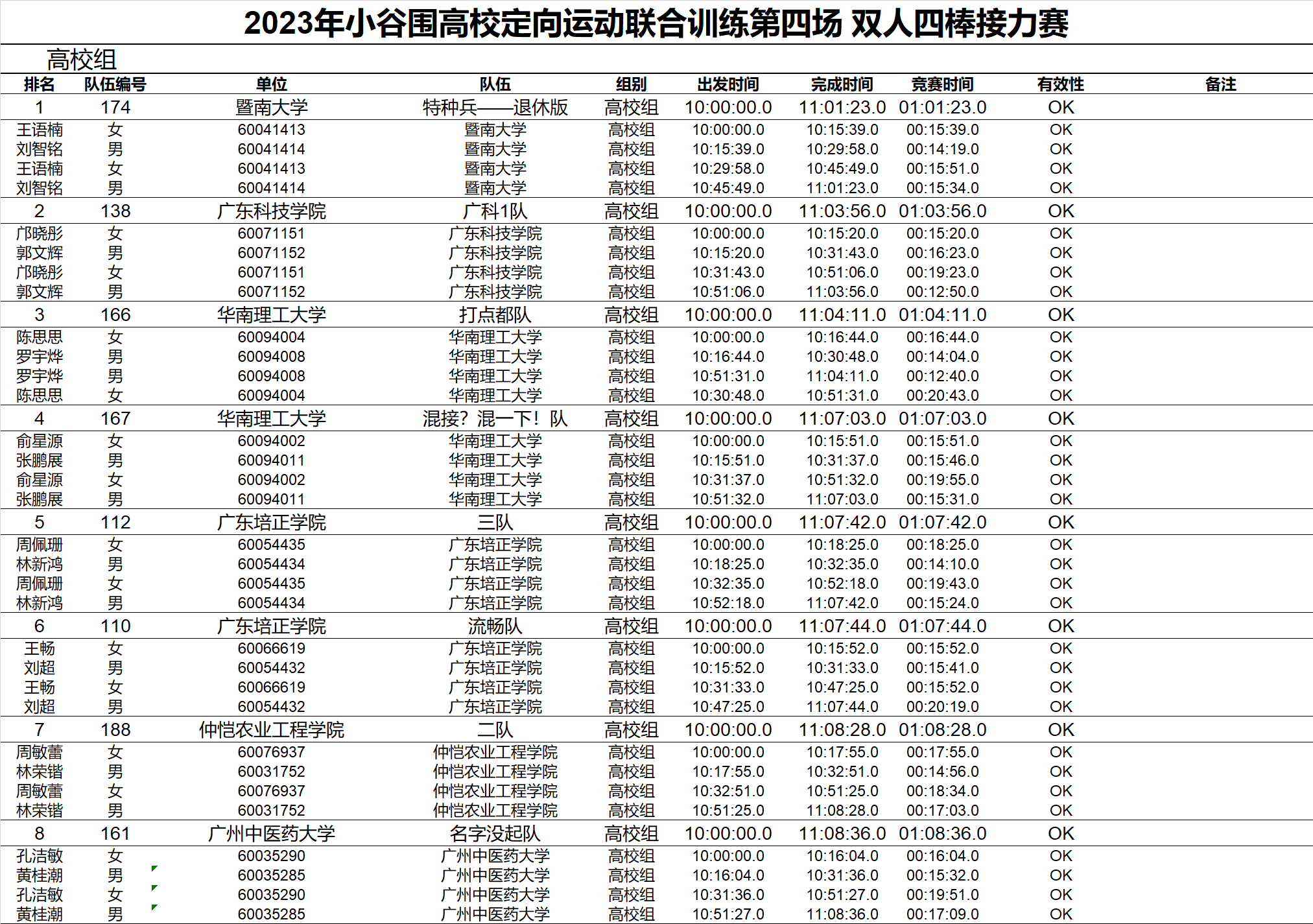如果是接力赛成绩,且某队的非第一棒次使用了集体出发。则会在队伍成绩的有效性处标记MASS_START,以表示该队伍有集体出发的运动员。