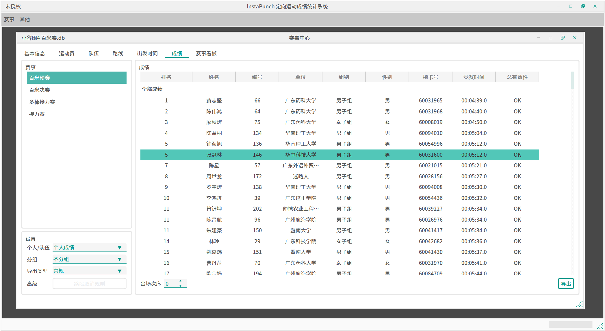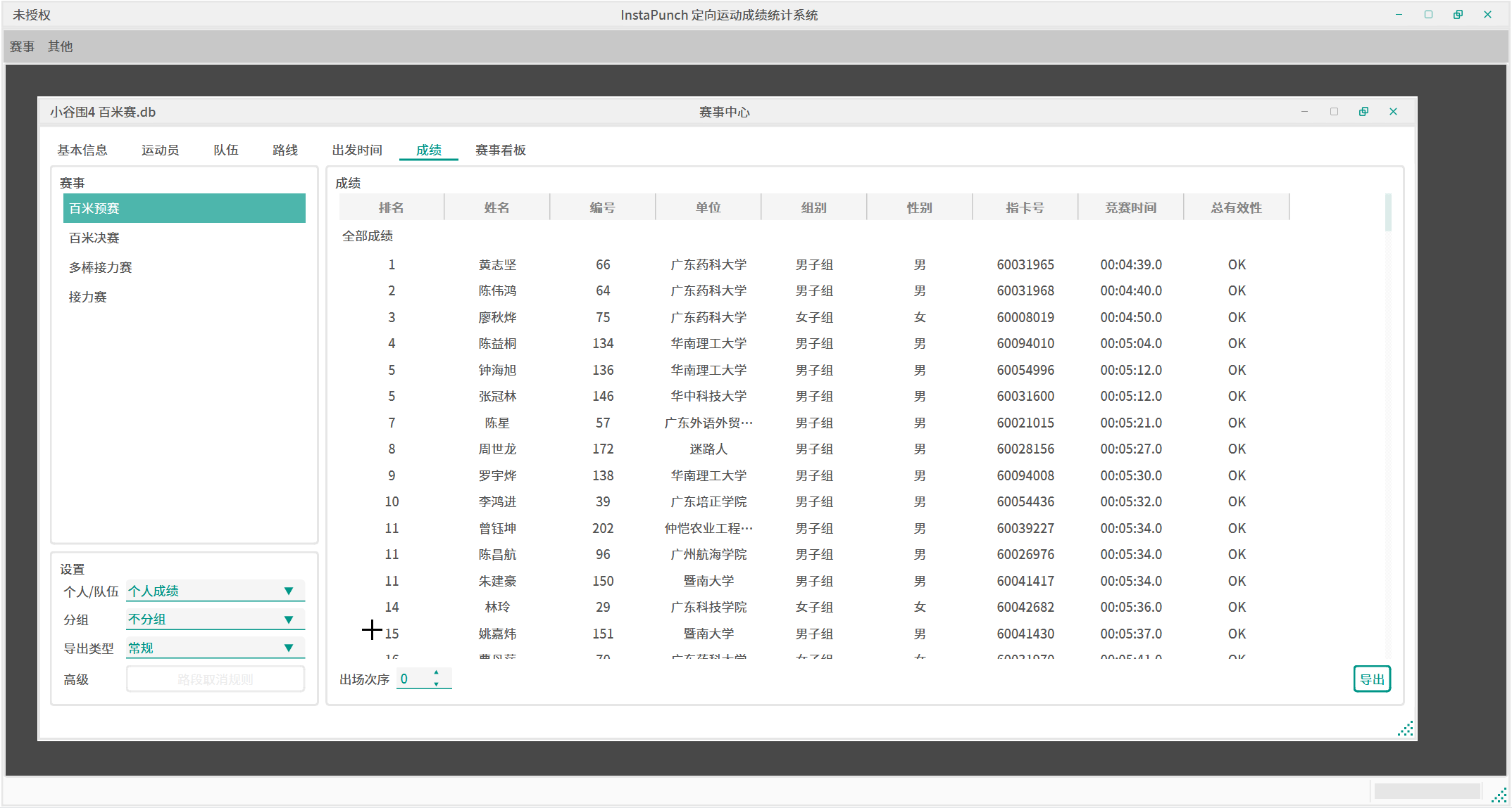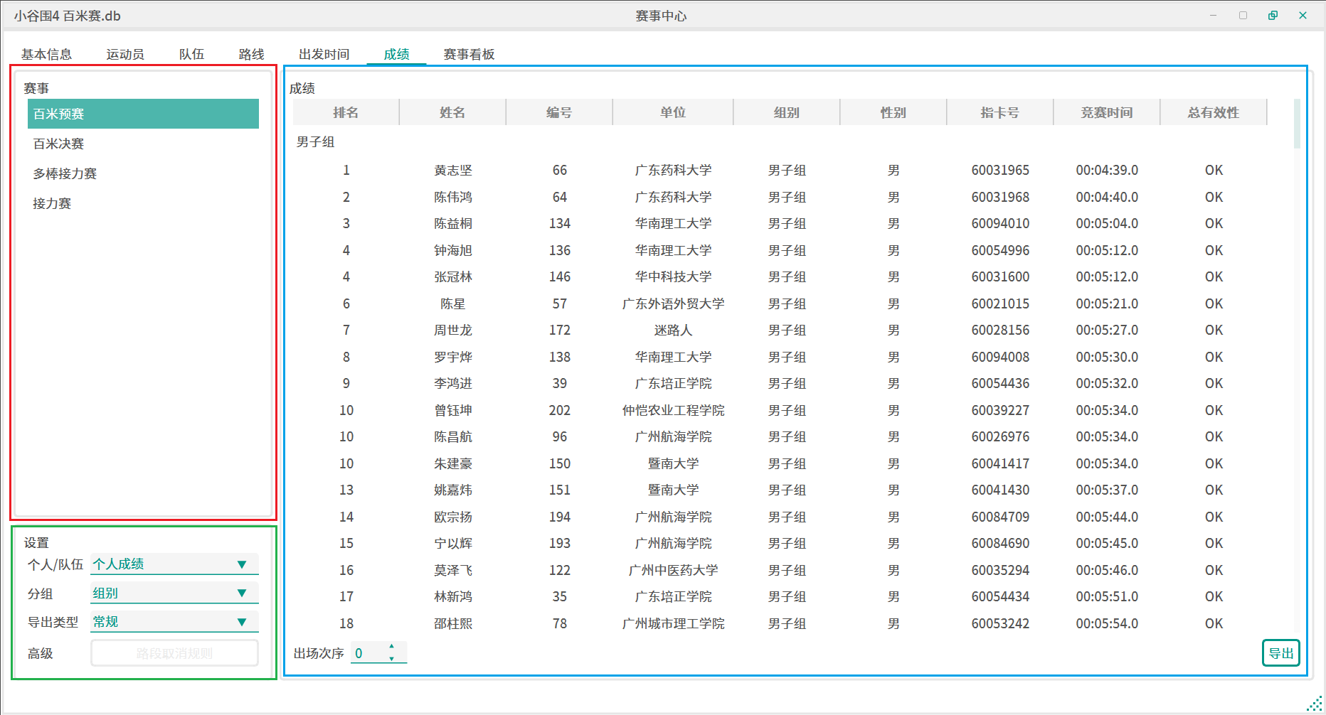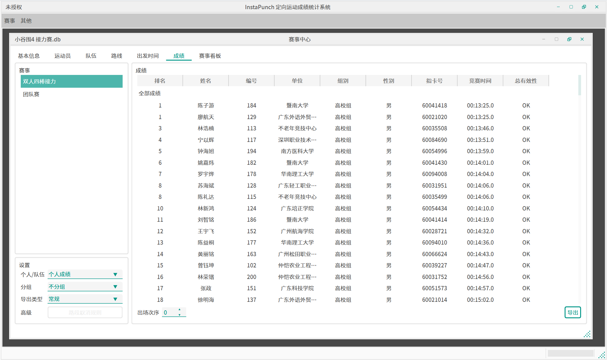 导出模式包括常规、分段、多场这三种。常规成绩就是平时的竞赛成绩;分段成绩会详细展示运动员各个检查点之间的成绩排名;多场成绩将允许你选中若干个赛事,并对这些赛事计算总排名,排名规则为先按总得分排名(非积分赛记为0分),然后按总用时排名。