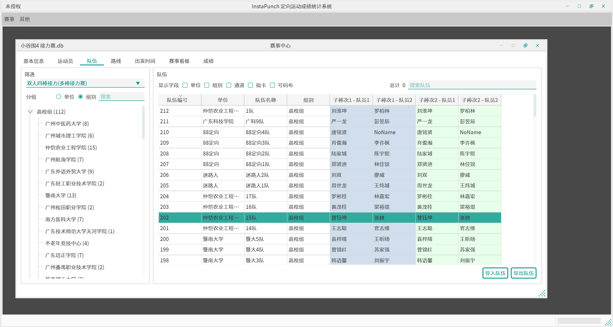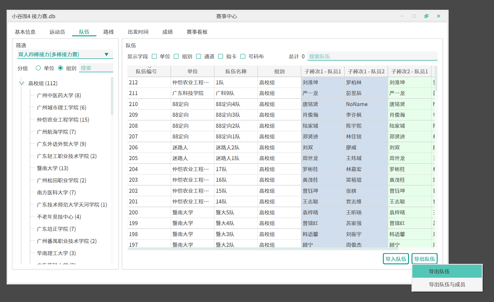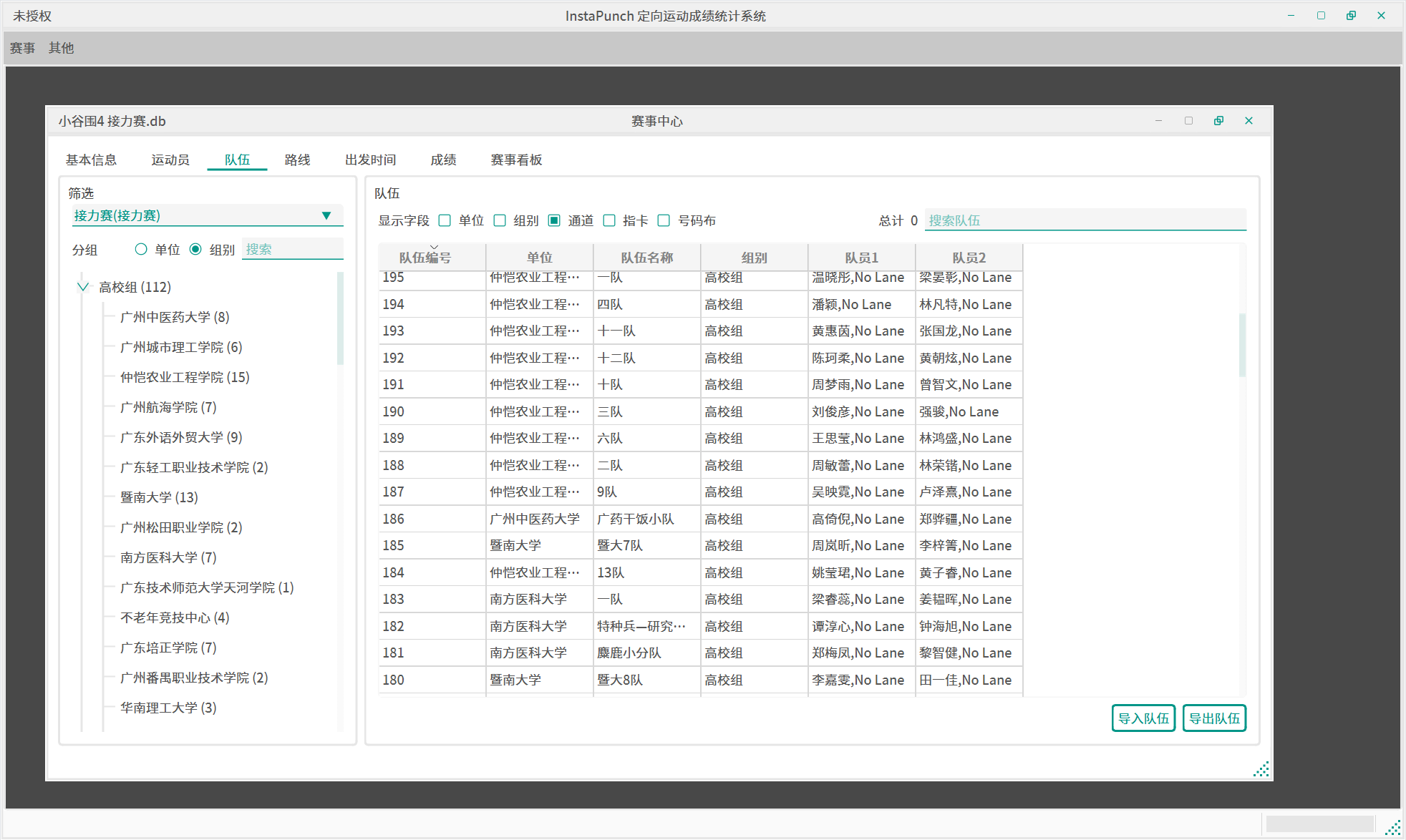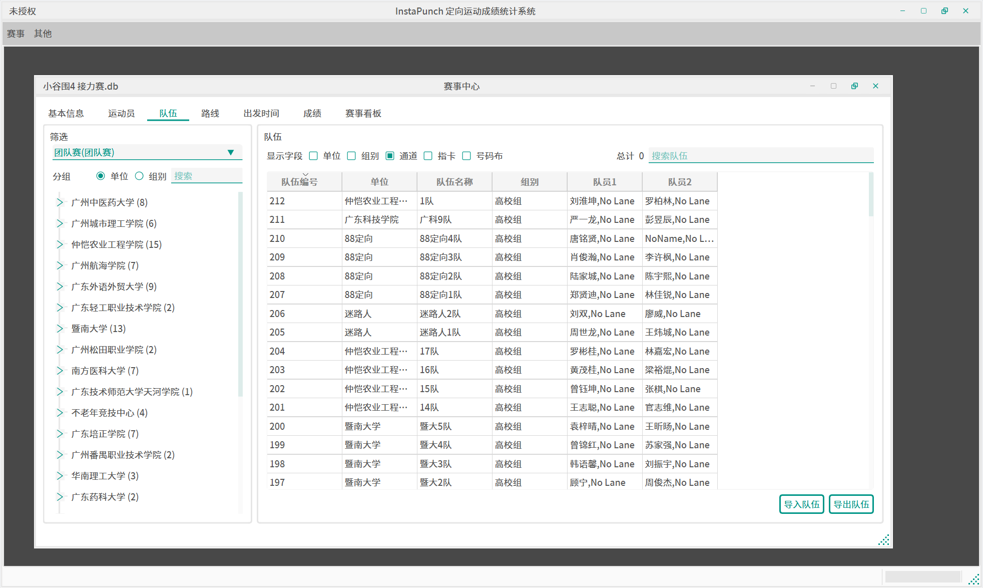 队伍页面与运动员页面的操作逻辑几乎一致,通过左侧树状导航栏进行分组、筛选,二层右键可以手动添加,右侧表格支持多选,双击修改单一队伍属性,右键提供批量修改操作,顶部的复选框可以更改显示的字段内容。