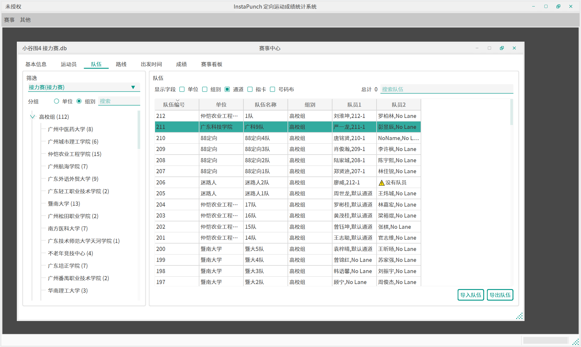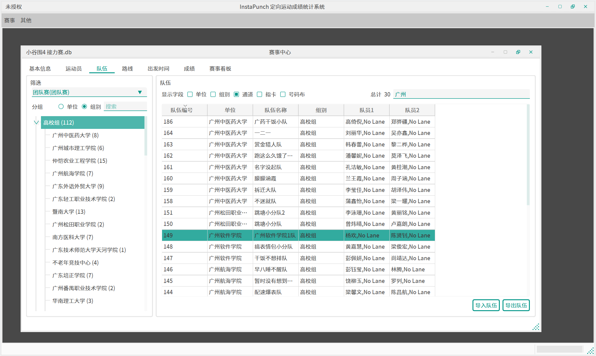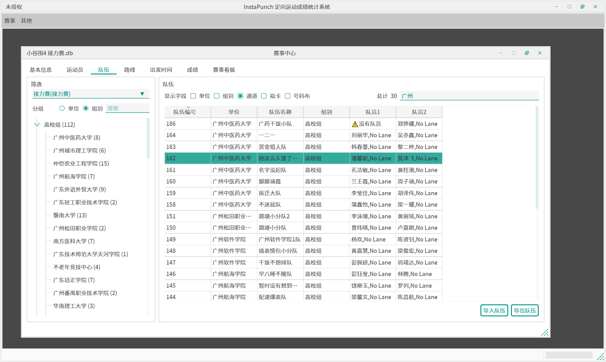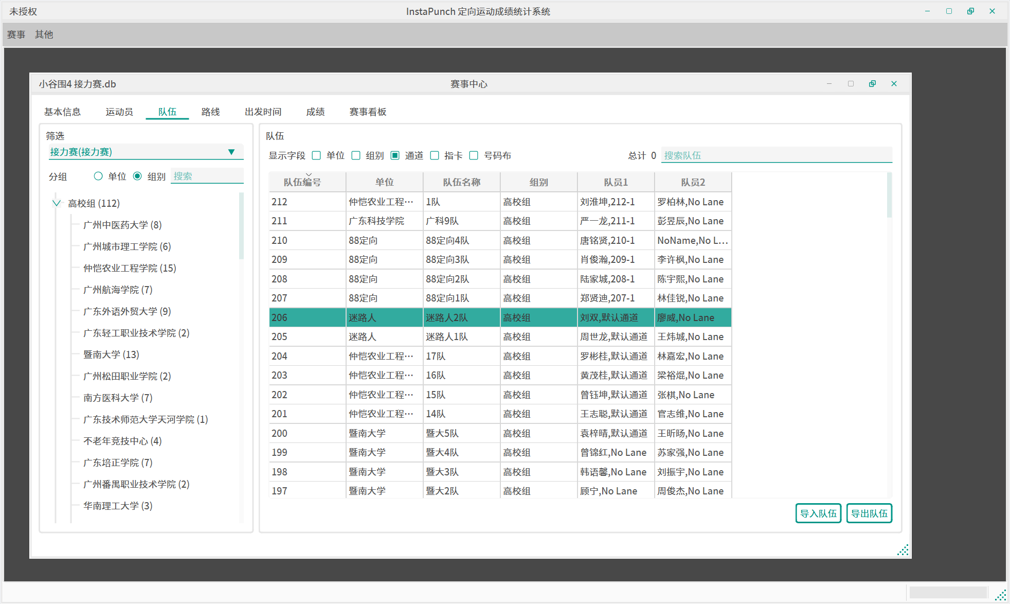 队伍页面与运动员页面的操作逻辑几乎一致,通过左侧树状导航栏进行分组、筛选,二层右键可以手动添加,右侧表格支持多选,双击修改单一队伍属性,右键提供批量修改操作,顶部的复选框可以更改显示的字段内容。