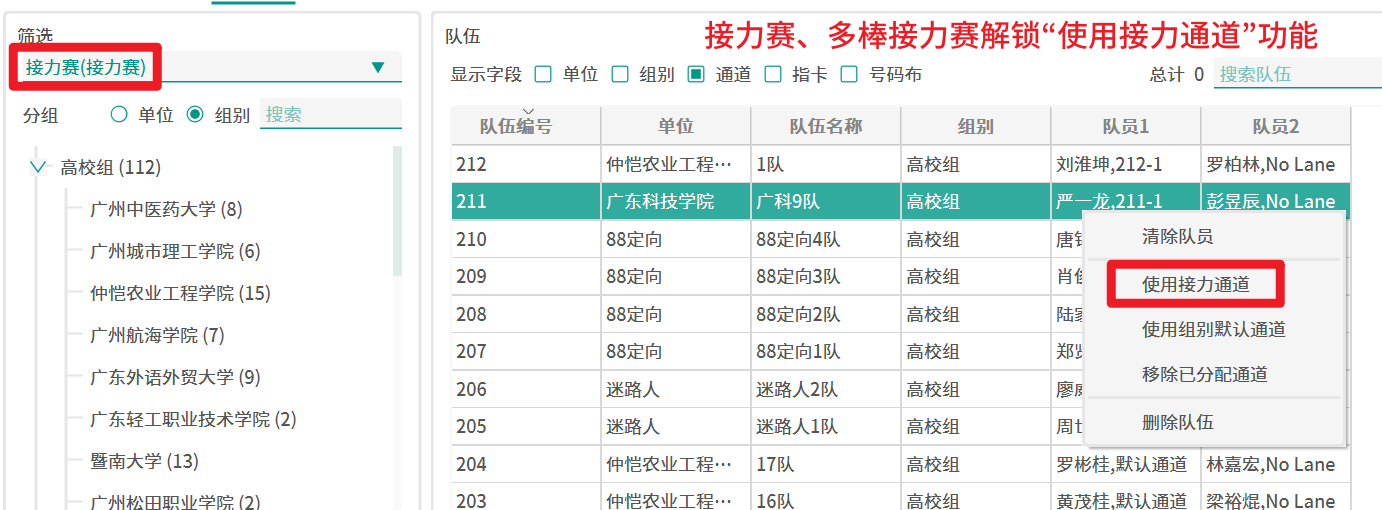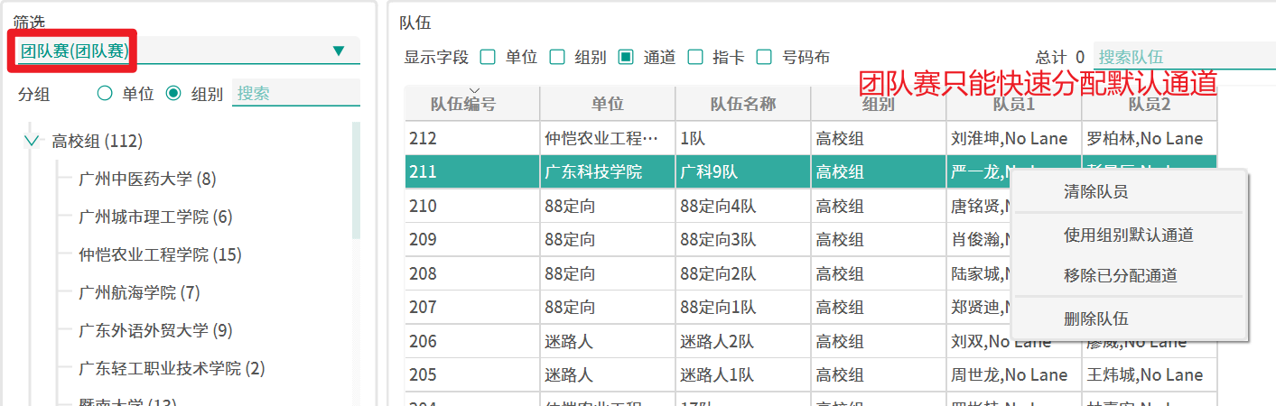 在队员列多选右键,会弹出通道便捷控制选项,包含使用接力通道(仅限接力赛)、使用组别默认通道移除已分配通道清除队员这些操作。