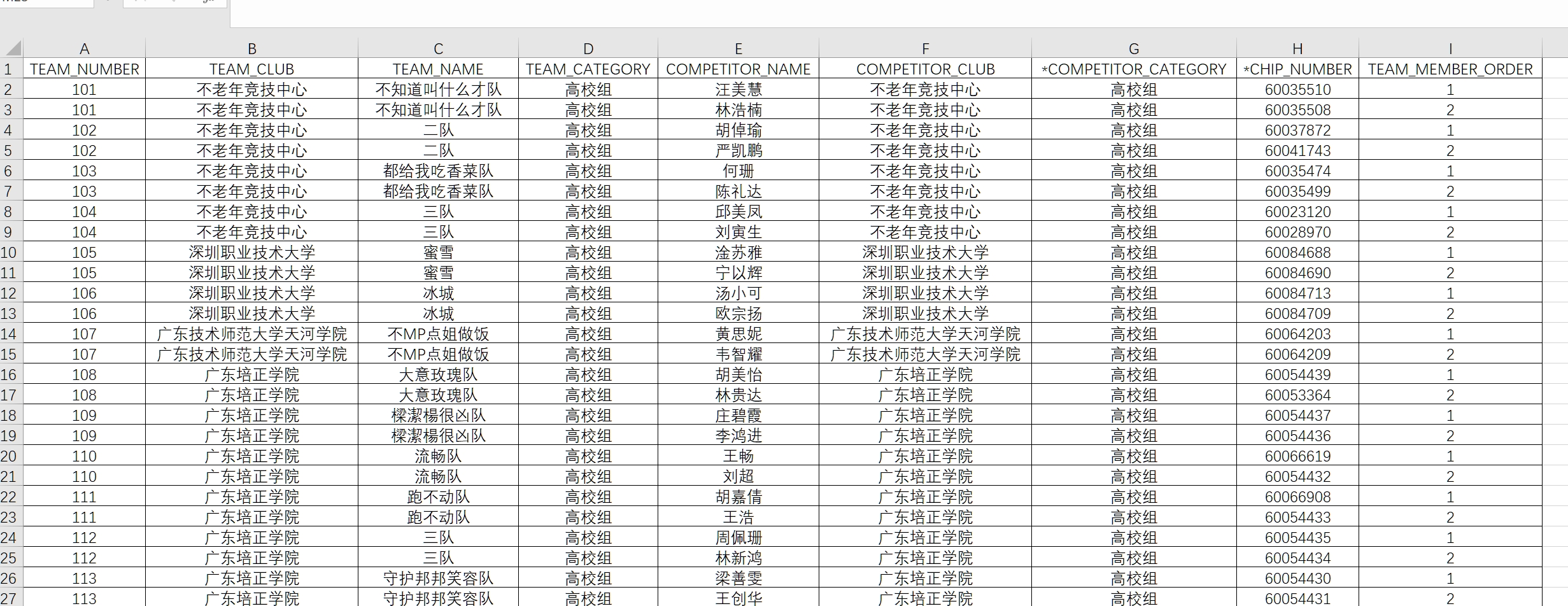 *CHIP_NUMBER运动员指卡号该字段导出时会存在,导入时不需要